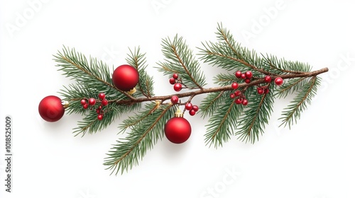 © Going Place, Fototapeta premium Realistic Christmas tree branch with red baubles and lights, isolated on a white background