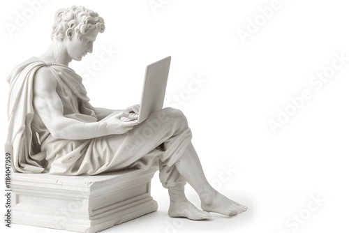© Oksana_Latysheva, Naklejka premium Realistic classic gypsum statue of man using a laptop for IT isolated on white background