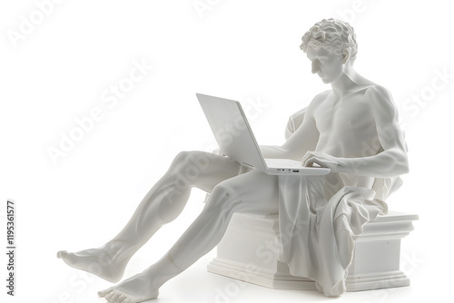 © Oksana_Latysheva, Naklejka premium Realistic classic gypsum statue of man using a laptop for IT isolated on white background
