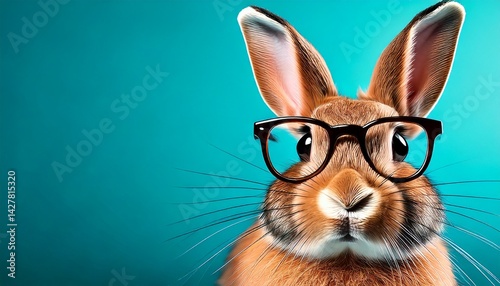 © Masrur, Fototapeta premium Realistic close-up of rabbit face with glasses, soft lighting, bright turquoise solid background
