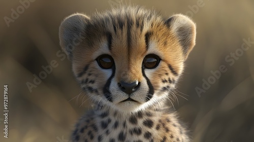 Obraz premium 26. **Realistic 3D depiction of a baby cheetah with soft spots and curious eyes