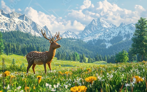 © Sergey Fedchenko, Naklejka premium Realistic 3D icon cartoon deer grazing in a lush green meadow with distant mountains