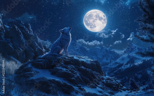© Sergey Fedchenko, Obraz premium Realistic 3D icon cartoon wolf howling at a full moon in a rocky terrain