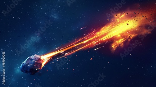 Obraz premium Realistic 3D Illustration of a Burning Comet: Asteroid with Fire Trail in Cosmic Atmosphere
