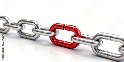 Obraz premium Realistic 3D illustration of a metallic chain with one distinct red link symbolizing a weak point or break in the system.