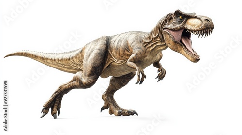 © arhendrix, Naklejka premium Realistic 3D rendering of a roaring Tyrannosaurus Rex dinosaur on a white background, showcasing its powerful build and sharp teeth.