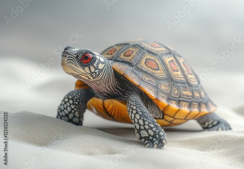 © ANUAR, Obraz premium Realistic depiction of a beautifully designed turtle on a sandy beach with a serene background, highlighting intricate shell patterns and vibrant colors.