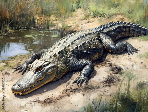 Obraz premium Realistic depiction of a crocodile basking in the sun near a serene water body surrounded by lush greenery and vibrant natural habitat environment