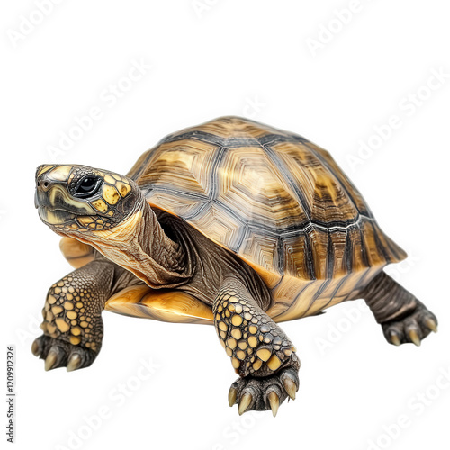 © PERFECTisME, Obraz premium realistic depiction of a tortoise. showcasing its intricate shell patterns and textures the tortoise is positioned prominently against a plain white background. highlighting its features and creating