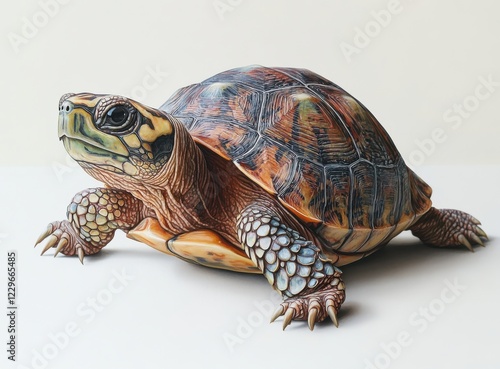 Fototapeta premium Realistic depiction of a turtle showcasing detailed textures and vibrant colors, emphasizing its unique shell patterns and lifelike features in a bright setting.
