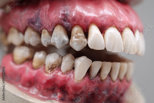 Fototapeta premium Realistic depiction of dental problems illustrating severe tooth injuries and decay with an emphasis on uneven smile and gum condition