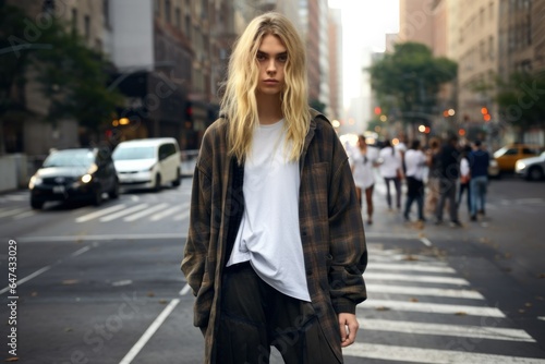 © Tuyres, Fototapeta premium Realistic Digital Painting Candid Portrait of a Fictional Young Beautiful Woman Wearing Large Urban Grunge Clothes. Generative AI Illustration.