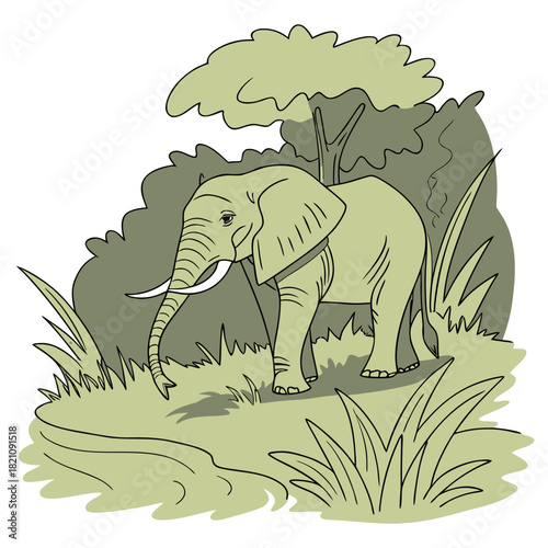 © Badmash Abid, Naklejka premium Realistic Digital Painting of an Elephant Standing Near Water - Scenic Wildlife Illustration with Grass and River Background