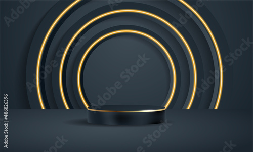 © Algoffy, Naklejka premium Realistic elegant luxury 3D rendering dark blue cylinder minimal scene geometric platform podium product display background with golden shine for Presentation, Showcase, Cosmetic, Pedestal Scene.