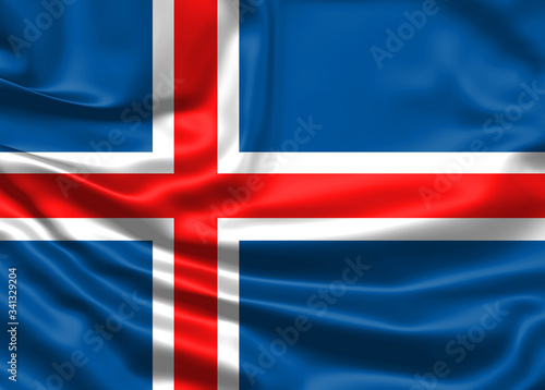 © Evgenia, Naklejka premium Realistic flag. Iceland flag blowing in the wind. Background silk texture. 3d illustration.