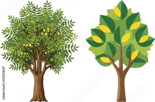 Naklejka premium Realistic fruit tree illustration, stylized abstract tree design, botanical artwork, green leaves, yellow fruits, nature drawing, comparison concept, educational plant art