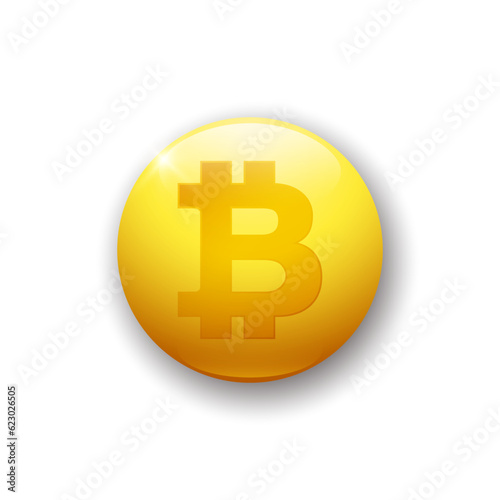 Obraz premium Realistic glossy button with bitcoin icon. 3d vector element of yellow color with shadow underneath. Best for mobile apps, UI and web design.