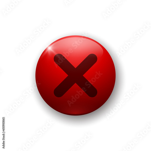 Obraz premium Realistic glossy button with cancel or exit icon. 3d red vector element on white background with shadow underneath. Best for mobile apps, UI and web design.