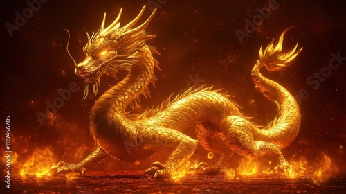 Obraz premium Realistic golden dragon with glowing accents on a vibrant red and gold...