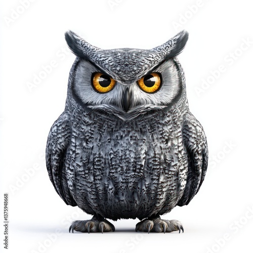© PANINN 369, Fototapeta premium Realistic Gray Owl with Striking Yellow Eyes Set Against White Background in 3D Render Style