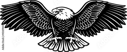 Obraz premium Realistic, iconic American Bald Eagle spreading its wings, hovering over a...