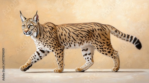 © Pricha.RT, Obraz premium Realistic Illustration of a Walking Serval Cat on a Beige Background