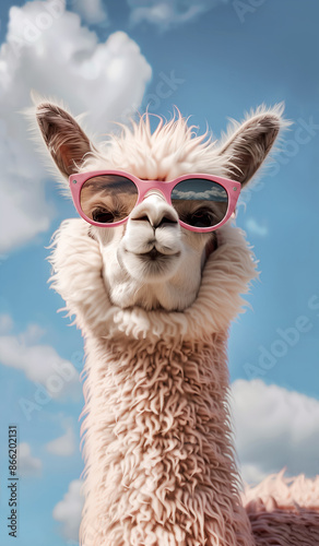 © Liudmila, Obraz premium Realistic image funny fluffy alpaca with sunglasses over blue sky and clouds background. Fashion portrait of an alpaca with hipster sunglasses over. Ecotourism , animal concept.