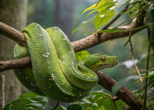 © Normal Desing, Naklejka premium Realistic image of a green tree python coiled around a branch in a lush tropical forest environment high detail macro view