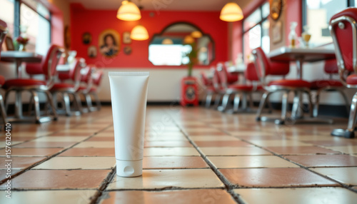© rada, Obraz premium realistic image of a product placed on rough tile floor in a retro diner