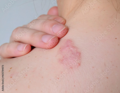 © Poomanan, Fototapeta premium Realistic image of a woman touching a healed keloid scar on her collarbone