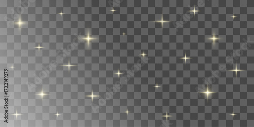© Tami Yako, Naklejka premium Realistic Isolated Gold Stars Light flare on Transparent Background. Christmas background. PNG picture. Vector illustration.