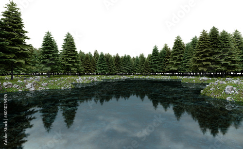 © MIRROR IMAGE STUDIO, Fototapeta premium Realistic lake and forest tree line. 3d rendering of isolated objects.