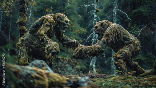 © MaVeRa, Obraz premium Realistic living two fighting for territory trolls in the forest in Norway
