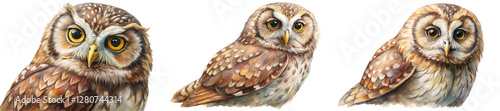 Naklejka premium Realistic owl illustrations, detailed feathers, vibrant colors, wildlife art, nature-inspired design, educational purposes.