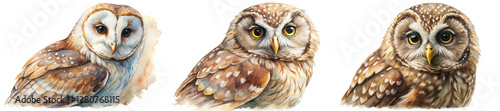 Naklejka premium Realistic owl illustrations, watercolor style, detailed feathers, nature...