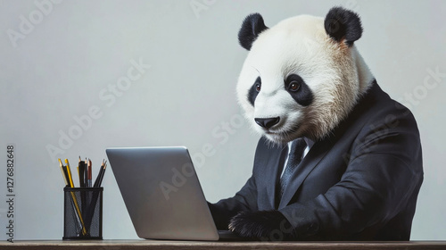 © Taras Vykhopen, Naklejka premium Realistic panda in business suit works intently at laptop in modern office environment