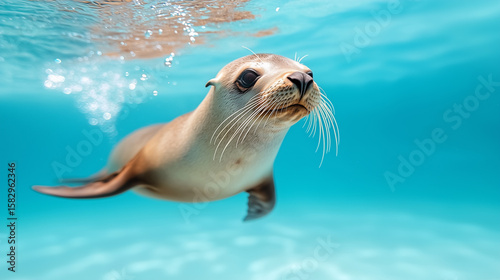 Fototapeta premium Realistic photo of a sea lion swimming underwater with streamlined body and bubbles trailing in clear blue water.