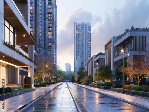 Fototapeta premium Realistic photo of an elegant street in a modern city at twilight