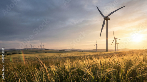 Fototapeta premium Realistic photograph capturing multiple wind turbines in a vast golden crop field at sunset.