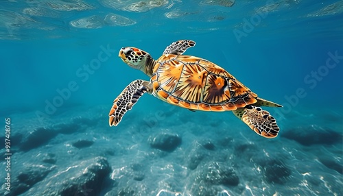 Obraz premium realistic photographer A tropical turtle swimming in a clear blue ocean.