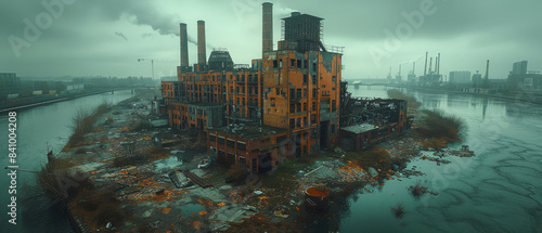 Fototapeta premium realistic photography of a big destroyed cyberpunk industrial complex created...