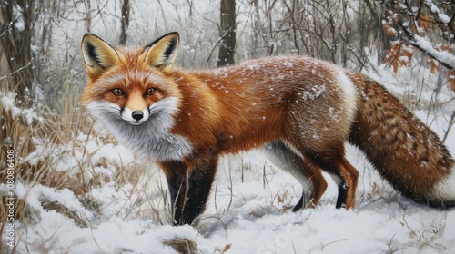 © 69, Fototapeta premium Realistic Portrait of a Red Fox in a Snowy Landscape, Capturing the Beauty of Nature With Lush Fur, Alert Expression, and Enchanting Wilderness Setting