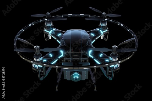 Obraz premium Realistic quadrocopter drone with propeller fans, front view, smmetrical, glowing backlit details on black background, AI generative