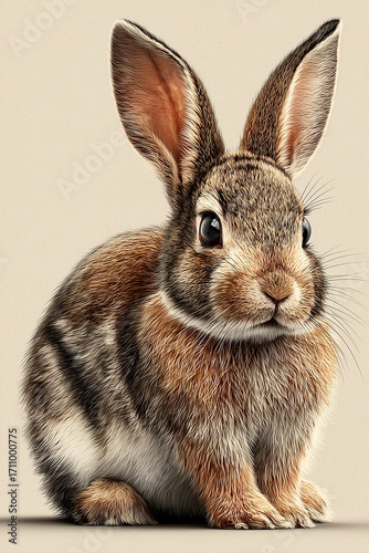 Obraz premium Realistic rabbit sitting with ears up, fluffy fur, white background.