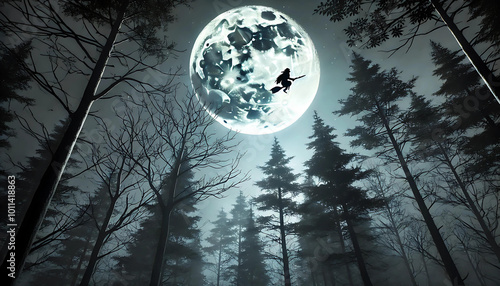 © Non, Naklejka premium Realistic Shot of Full Moon Shining Through Trees with Flying Witch, Ample Copy Space
