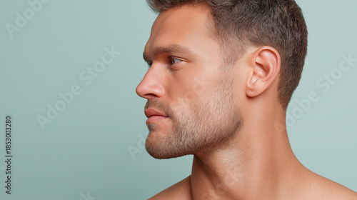 © Marut, Fototapeta premium Realistic skin texture with sun kissed warmth across cheeks on young man with short hair and trimmed beard looking sideways against plain background