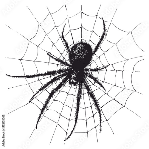 © MrOwlCreatives, Obraz premium Realistic Spider on Web Hand Drawn Vector Illustration