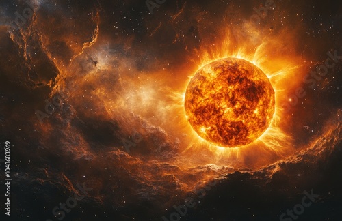 Fototapeta premium Realistic Sun with Solar Flares on Starry Background in Space