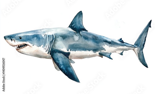 © PANINN 369, Naklejka premium Realistic Watercolor Illustration of a Great White Shark Swimming Gracefully in Ocean Waters