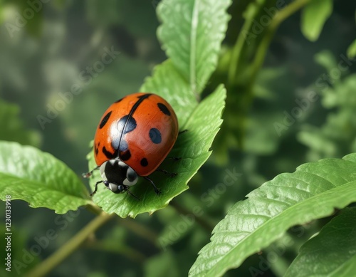 Fototapeta premium Realistic watercolor ladybug on green foliage, fauna, summer, flora, realistic